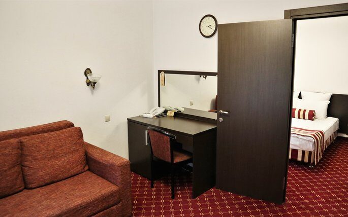 Услуги и удобства: ТуалетВаннаТуалетные принадлежностиПолотенцаТелевизорХолодильникЭлектрический чайникФенКондиционерСейфТелефонШкаф/гардеробДиванКреслоРабочий столБалкон (во всех номерах, кроме первого этажа)Бесплатный Wi-FiКовровое покрытие